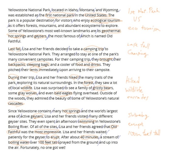 たとえば↓の例文で、読みながらキーワードに印をつけて、それぞれのパラグラフの横に要点を書いてみました(オレンジ色。青色はつぎで説明します)。