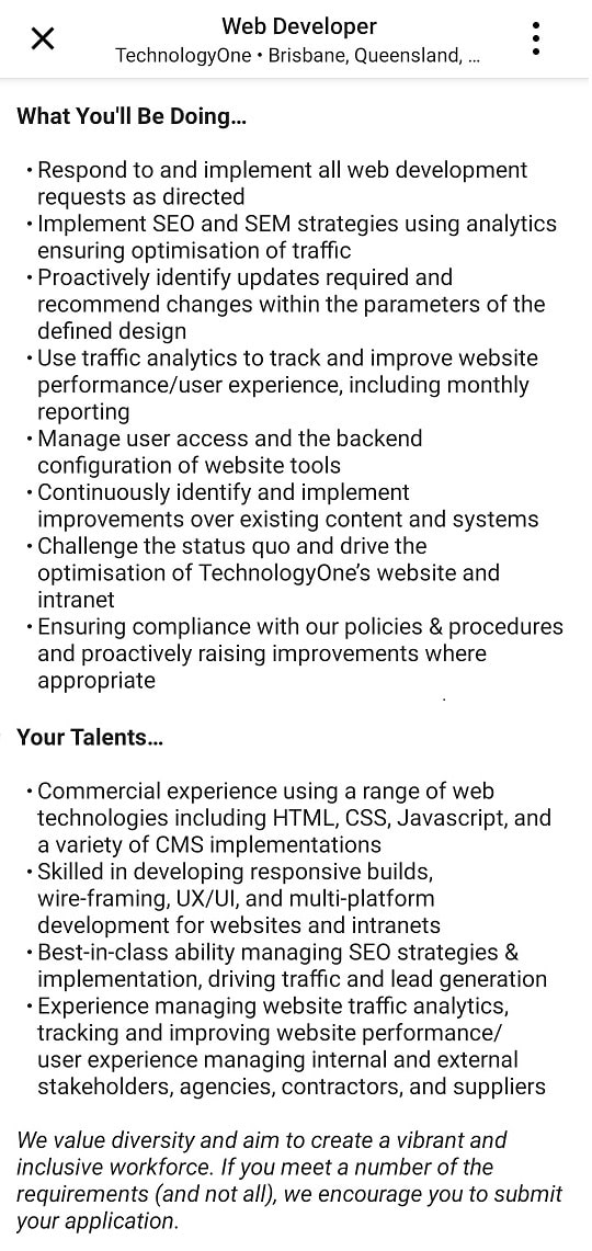BrisbaneでのWeb Developerポジションである下の求人を見てみます。