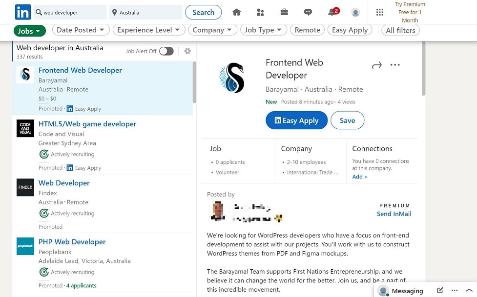 では実際に検索結果の例をいくつかみてみましょう。試しに「Web Developer」を「Australia」で検索にかけてみました。